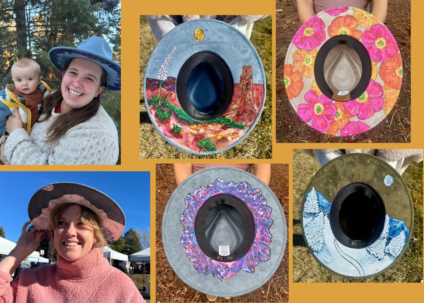 Add a special touch to any outfit. These hats are one of a kind - with an original painting on the underside of the brim of each one. Choose one that will make you stand out and take your outfit to the next level.